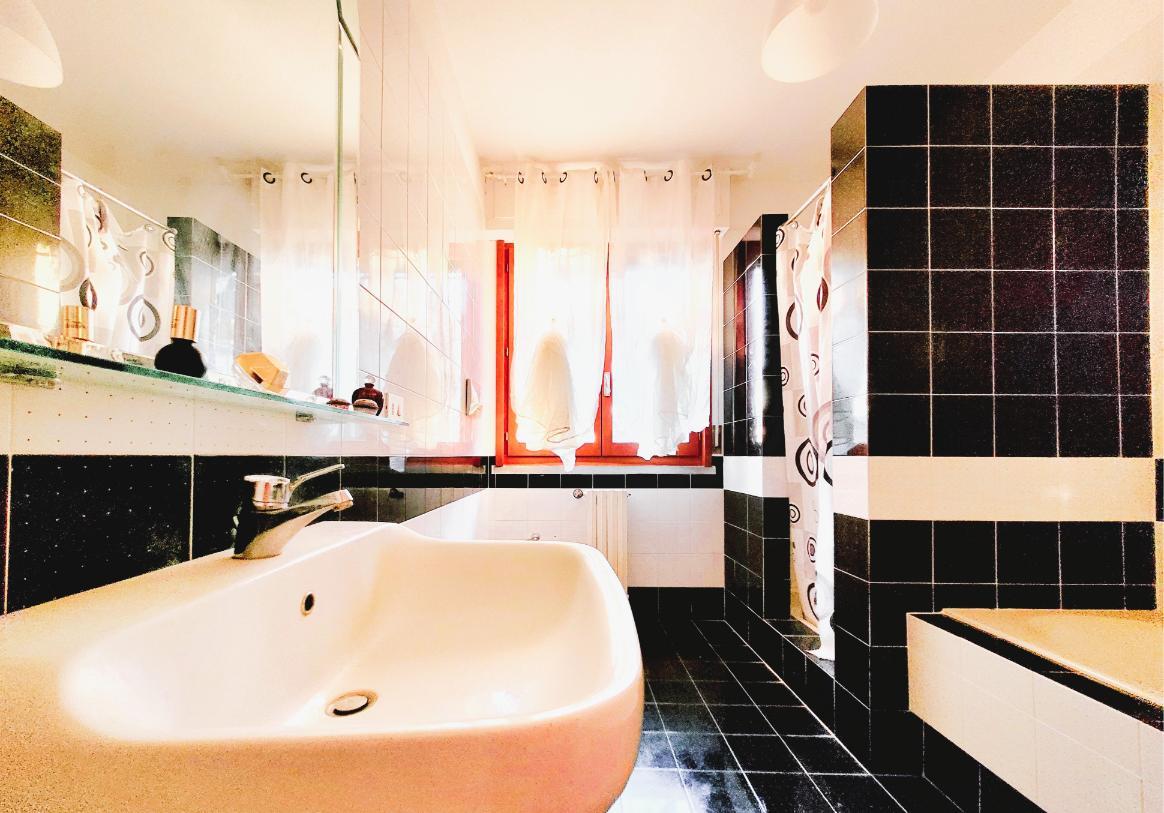Scendendo al piano seminterrato, troviamo una spaziosa taverna oggi usata come zona living. La taverna è collegata internamente al garage doppio. Esternamente, completano la proprietà due posti auto assegnati ad uso esclusivo.